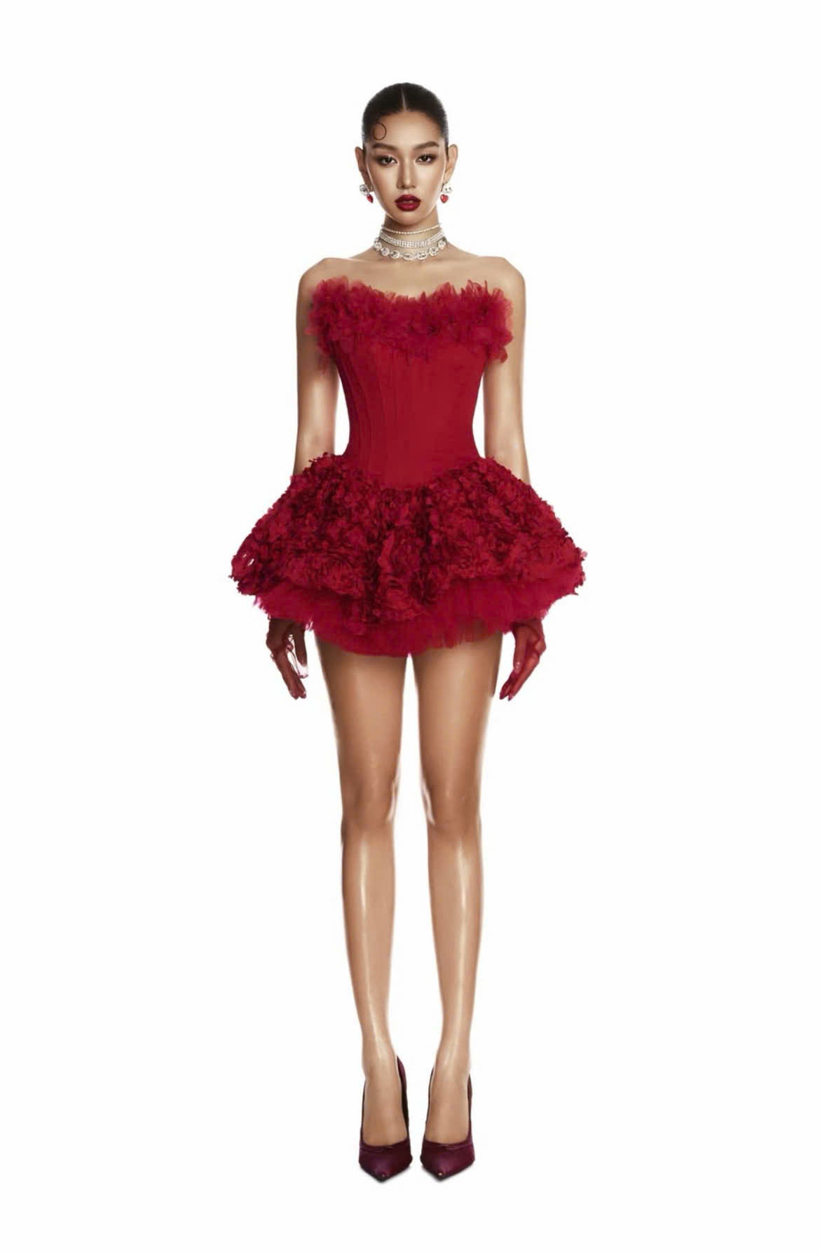Crimson Bloom là Chiếc váy dạ hội cao cấp mang sắc đỏ đầy mê hoặc. Thiết kế nâng cấp một vòng, đồng thời tạo điểm nhấn nổi bật. Phần chân váy xếp tầng bồng bềnh, do đó mang lại hiệu ứng chuyển động thương mại.